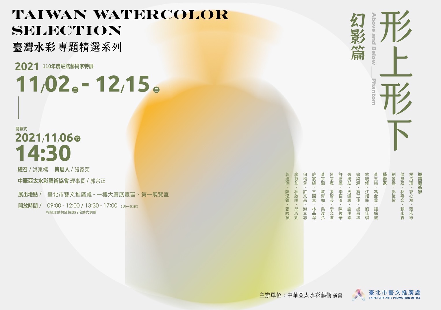 Home Events 活動 臺灣水彩專題精選系列- 【形上形下-幻影篇水彩大展】 臺灣水彩專題精選系列- 【形上形下-幻影篇水彩大展】之前因為疫情被打亂的【形上形下-幻影篇水彩大展】,終於開辦囉!策展人是張家荣Chang Chia-Jung(簡介:http://turnerstudio.com.tw/teacher),此次展覽共有8位邀請藝術家、33位徵選藝術家,其中也有Gill Chang的作品喔,歡迎大家蒞臨現場,感受圖畫原作的震撼力!展覽地點:藝文推廣處藝文大樓 臺北市松山區八德路三段25號 一樓大廳展覽區與第一展覽室展期:2021/11/2(二)~12/15(三)週一休館開放時間: 一樓大廳展區9:00-21:00, B1第一展覽室9:00-17:00開幕典禮:2021/11/6(六)下午2:30策展人:張家荣邀請藝術家8位: 郭心漪、張宏彬、楊治瑋、侯彥廷、林嘉文、賴永霖、劉晏嘉、郭俊佑徵選藝術家33位: 黃玉梅、馮金葉、鐘銘誠、林毓修、江翊民、劉佳琪、翁梁源、蔣玉俊、操昌紘、張綺舫、周運順、謝明錩、許德麗、李招治、陳俊華、呂宗憲、張綺芸、李文淑、綦宗涵、歐育如、吳浚弘、許宸緯、王國富、林品潔、何栴芳、許文昌、游文志、廖敏如、林啟明、邱巧妮、郭進傑、陳泓錕、張吟禎 歡迎大家共襄盛舉!+ Add to Google Calendar+ iCal / Outlook exportThe event is finished. Date10 月 22 2021 - 12 月 15 2021Expired! Time 10:30 am - 5:00 pm Category 活動Share this event