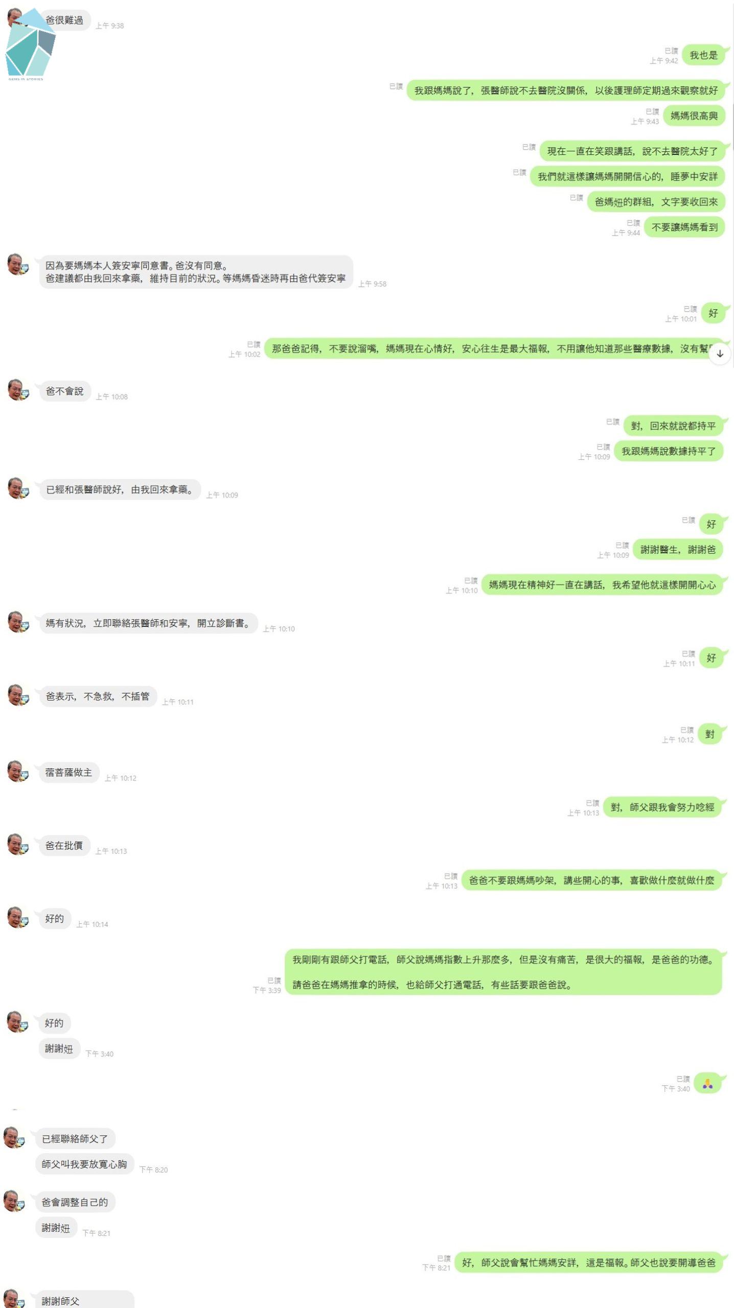 修身齊家書小說連載親人家庭相處修身齊家書(82)離別前奏曲 by 明仁 08-17-2024 written by 明仁 08-17-2024 416「修身齊家書」導覽頁:https://gemsinstories.com/topic/family/18922/👉點看上一篇:(81)尋求解脫 https://gemsinstories.com/novel/memory/294650/惠惠的兩個眼睛都有白內障,本來她不想要換人工水晶體,說平常醫生已經看的夠多了,不想要再動手術。但後來發現會影響安全,每次半夜起來上廁所、清晨下樓梯,眼睛都霧茫茫的,非常危險。111年10月底,惠惠終於鼓起勇氣去換了人工水晶體,一次一隻眼睛,兩眼相差12天。10月26日回診,張醫師說:醫師說:「檢驗的數據顯示,從惠惠阿姨不打針,改用口服化療以後,各項檢驗數據都顯示身體各部分在進步。原來在及格邊緣的紅血球和白血球都提升了,連CEA都降了下來,表示沒有擴散,其他的數據都令人放心。唯獨CA-199數據在上升,CA-199已經破200了,表示胰臟內的癌細胞多了,這樣病人會很不舒服,有時候會痛得滿床翻滚,那個時候要打止痛針。」他指著電腦說:「建議阿姨回來住院,安寧病房所有的身心靈治療能及時給阿姨幫忙。」什麼?!自從惠惠沒有到醫院以來,心情一直很好,臉色紅潤,水腫也慢慢在退,感覺病情越來越好了啊,我甚至期待會有痊癒的可能,怎麼可能開口叫惠惠來住院呢?何況現在要她踏進醫院都有困難了,更別說強迫她住院,怕傷害到惠惠呀!我連忙告訴醫師我的顧慮,也告訴醫師應該說服不了她,請醫師加強止痛劑量,我會看情況給惠惠使用,必要的時候再請護理師到家裡看惠惠。我邊說邊丢臉的流出眼淚,一面止不住流淚,一面向醫師說:「我知道該為惠惠的生命終點做準備了,我會在家裡好好顧著、陪著,惠惠時間到了她不要插管不要急救,就讓她順順的走好了。」眼淚如江河潰堤一發不可收拾,摸著口袋想要拿衛生紙,護理師送上來一叠。醫師說:「好好,止痛的劑量提升,其他的護理就請北北您負擔起來。」批價領藥的時候,我跟女兒傳訊息,女兒說想讓最愛的媽媽可以沒有痛苦、平平安安的進入善終: 民國111年11月份,惠惠常喊左大腿內側會酸麻,有時候會痛,用手輕撫、熱毛巾熱敷,似乎沒有什麼效果。11月21日晚上,準備送惠恵進房間休息,惠惠指左大腿說:「這裡很酸很麻又很痛。」我說:「吃個止痛藥?」惠惠搖搖頭。我說:「熱敷?」惠惠搖搖頭: 「或許好好睡一覺,明天起床就好了?」家裡的樓梯很窄,兩個人併行常有踉蹌,上下樓梯都要很小心的扶著,上樓梯時我走後面,扶著惠惠的腋下慢慢走;下樓梯時,我在前面倒著走,一樣扶著腋下慢慢走。有時候走著走著不小心搔到癢處,會莫名其妙的哈哈大笑,也算是病中的小玩樂。這一天晚上要上樓時,我忽然想到,現在惠惠的左腳不舒服,扶著腋下好像對腳的助力有點遙遠,就改用頭頂著惠惠的屁股,惠惠嚇一跳叫:「你幹什麽?我要報警了!」我接著說:「這裡是110,有事請講。」惠惠笑得更大聲說別鬧了,我高興的笑著陪她走上了樓梯。誰知。這是惠惠最後一次走這樓梯。民國111年11月22日,清晨3:00被惠惠叫醒,悚然一驚,看惠惠一臉驚慌的喊:「很痛很痛!」眼淚掛在眼睛上。我趕緊蹲了下來問:「那裡很痛?」惠惠說:「左大腿,很痛很痛!」我試著碰一下她的左大腿,她慘叫一聲,我沒有意識到這種反應是非常痛的意思,竟然脫口而出說:「有這麽痛嗎?」話一說出口就知道講錯了,我這是一副懷疑惠惠在大驚小怪的態度,受傷的惠惠淚如雨下,還不斷哀嚎疼痛。我打電話給女兒,女兒說:「爸,你趕快叫救護車!我馬上過來!」我趕緊打119,不到5分鐘,女兒跟救護車都趕到了,救護人員立即量體温、量血壓、問情況,看惠惠痛成那個樣子,就把惠惠移到擔架椅子上抬下樓,然後送進救護車咿唔咿唔的緊急送萬芳醫院。急診科醫師照X光,告訴我們:「左髖骨斷了,是粉碎性骨折,要立即開刀換人工髋骨,已經和骨科聯繫好了,待會兒就會有手術前簡報,預計中午左右動手術。」我走出急診室向惠惠說明,惠惠含著眼淚說:「你居然不相信我,還問:『有這麽痛嗎?』」修身齊家書」導覽頁:https://gemsinstories.com/topic/family/18922/👉點看上一篇:(81)尋求解脫 https://gemsinstories.com/novel/memory/294650/👉點看下一篇:(83)風來雨至,力大無邊 https://gemsinstories.com/topic/family/295124/覺世代 ‧ Gems in stories 首頁:https://gemsinstories.com/ 居家安寧換人工水晶體換人工髋骨白內障手術粉碎性骨折胰臟癌 0 comment 0 FacebookTwitterPinterestLINEEmail 明仁Leave a Comment Cancel ReplySave my name, email, and website in this browser for the next time I comment.* By using this form you agree with the storage and handling of your data by this website.