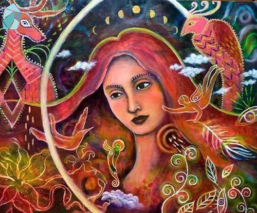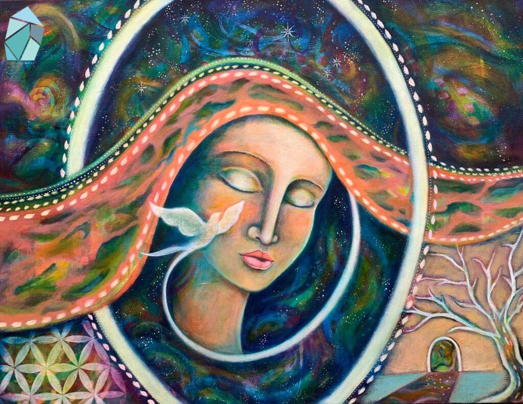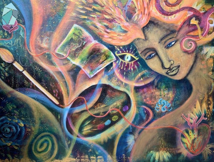 圖文手作生活美學體驗直覺繪畫之旅直覺繪畫之旅 (3) 神聖臉孔 by Joy 03-09-2022 written by Joy 03-09-2022 928「直覺繪畫之旅」導覽頁:https://gemsinstories.com/illustration/7988/在開始畫畫之前,我已從事髮型設計工作數年的時間。因此我對於臉孔會比一般人多了一些觀察與感覺。有時從一個人的臉,我就會聯想到一些色彩或是畫面。例如我有一位職業是塔羅師的客人,當我看到她的長捲髮時,我就會聯想到宇宙般的藍紫色彩,以及從她深黑捲髮中竄出的神祕符號。最開始畫圖的目的只是想簡單紀錄一下客人的髮型,但在學習直覺繪畫之後,色彩與感受變得更敏銳。慢慢地畫本中與畫布上累積越來越多的臉孔。回想起來,某些巧合就是鋪好的道路,慢慢引領我前進。因為我有一部份的顧客從事的是身心靈工作。如靈氣,氣功,星座,塔羅,催眠……等等,因此在沙龍工作的那段時期,我對於靈性世界的興趣就埋下了一顆種子,但從未真正的去體驗過。直到因為家人生病後,對生命產生了疑惑,偶然中遇到直覺繪畫,它結合了探索直觀與精神世界之門,讓我在不知不覺中探索自我。喜愛靈性生活與圖像的人,手邊應該都有幾副神諭卡(Oracle Cards)或是塔羅牌卡。我在「直覺繪畫之旅 (1) 從心開始的「藝術日誌」(Art Journal)」中,有談到2016年翻到 Flora Bowley 的書,開啟了我的直覺繪畫之旅,她也成為了我的偶像。在一次Flora Bowley 訪談藝術家影片中,我認識了Shiloh Sophia老師。她的作品讓我感覺很孰悉,才赫然發現自己手邊使用的聖母瑪麗亞神諭卡正是Shiloh Sophia老師的作品!Shiloh的作品有一種聖像畫的能量氛圍,色彩飽滿充滿活力。這篇文章的最後有放兩段影片,一是我的偶像 Flora Bowley ,二是 Flora Bowley 訪談Shiloh Sophia的影片,有興趣的朋友可以參考~那時期剛好我的繪畫主題都是臉孔,因此Shiloh的訊息來的正是時候。Shiloh也是以直觀繪畫出發,但會在探索靈性方面更加的深入。她結合神祕學(Occult)與薩滿領域(Shamanism),分享內在意識是如何運作與影響我們,藉由回顧過去,自我提問,建立信念與價值觀,探索自己的身份以及在世界上的生活方式。Shiloh也很關注環保,女性,孩童等議題,她強調,每個人都擁有改變世界的力量。課程的資訊量非常的龐大,每周有書寫日誌,符號學,集體靜心,夢境紀錄,繪畫等,以不同的方式來覺察自己。有些同學甚至分享了繪畫如何療癒喪子之痛或是自身的病痛。從這些經驗中我發現,想像力和傷痛彼此的關係:當我們有創傷時,記憶會存在或累積在身體與頭腦中。我們的想像,不管是正向或負向,都會影響所有自我領域,甚至在不知不覺中將某種形象、語言、探究和情感帶入生活中。Shiloh提供的這些方式,就是洞察自己與運用想像力,同時學習臣服,不支配結果。她也提到,繪畫是結合創造力與想像力的路徑之一,也是連接到神聖源頭與流動的方式。在重複練習的過程中,我們將會體認到,自己所經歷的變化與成長都慢慢變得越來越容易辨認出它的目的。花了一年多的時間,我才於拿到Shiloh老師的意識創造力課程結業證書。 我逐漸意識到,通過轉變一個想法或意圖等簡單行為,就能發生深刻的轉變!不限於畫布,在與父親的失智症相處上,也是我可以發揮創造力的地方!於是我開始關注父親整個行為的產生與家人關係,改變看待父親是「病人」的方式,以引導者的角度出發,也感謝因為父親這樣的課題,我才有機會更深入自我。我也開始與家人主動安排一些活動給父親,並從他的重複行為中找到一些協調與改變的方式。慢慢地,父親的行為也變的比較穩定規律,在身體與心理上都有了良好的進展。即使在生活中仍有突發狀況,但那種緊張感已經逐漸在我內心解除。畫也開始帶著我走,從一開始只想療癒自己的內在小孩臉孔,逐漸轉變為向外的神聖面孔,我覺得正呼應我在生活中角色的切換:從女兒的身分(想輕鬆玩耍內在小孩),到接納父親失智,轉為接近母親(神聖臉孔)的照護引導與包容角色。在畫的同時,我也感覺到內在力量的增強,在生活中也發生很多巧合。如接到教學邀請,發現離家很近的工作地點…..等。這兩種力量在我的體內相互平衡:內在小孩提醒著我玩耍與幽默的力量,而神聖面孔教導我對於未知領域的尊重與謙卑包容。這兩種力量成為我重要的生命根源,也讓我帶入日常生活之中。它們是我的一個根基。之後我也逐漸延伸出其他的練習,並且將對象從「人」切換到「大自然」以及融合其他事物。讓意識活在當下的每一刻就是通往宇宙的鑰匙。就像下面這幅畫,專注在當下就是走向通道,周圍自然會出現象徵。我已經習慣不打稿,從文字或是凌亂的線條開始放鬆後,讓它任意發展成自己的模樣。因此常常在一開始我都不知道最後會有什麼樣的作品出現。這幅畫中的女神向我發出邀請走進她的世界,表情溫柔強韌。回頭看自己的作品,畫中平靜、喜悅的能量仍一路貫穿著❤️。感謝一路陪伴著我🌸。 「通往內在神聖的道路」 2018 壓克力數年前的畫,現在自己再看仍覺得充滿神秘感。人像或許就是我們的內在都有神性的一種提示。那時的旅程也成為今日的養分。像是窺探到神秘宇宙的一角,想探索一切的可能性,體驗了各種輪廓的樣貌。下面這張作品「喚醒內在力量」 (2018 壓克力),畫筆與調色盤,象徵著自己所擁有的力量。當使用這些工具時,也是我開啟神聖世界的通道,允許自己臣
